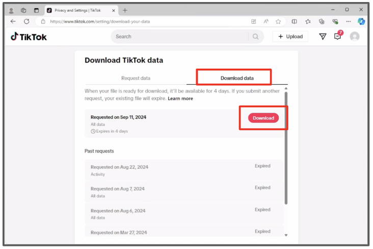 4. In a Microsoft Edge browser, return to your "Download Tik Tok data" page (User icon > Settings > Download Your Data) or navigate to https://tiktok.com/setting/download-your-data.