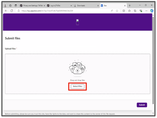 6. Navigate to the data upload page located at https://nyu.app.box.com/f/c7acc7cbc97c4b76a6589394b53b235f and click "Select Files".